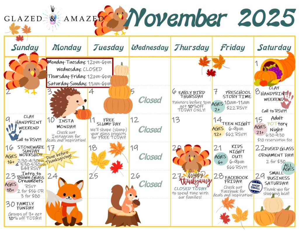 At Glazed & Amazed Studio we offer a space for customers who desire a creative challenge a little out of the ordinary. We host a wide range of monthly classes and events for all ages! Project will be completed during class and left at the studio to be fired and ready for pick up in about 7 days.