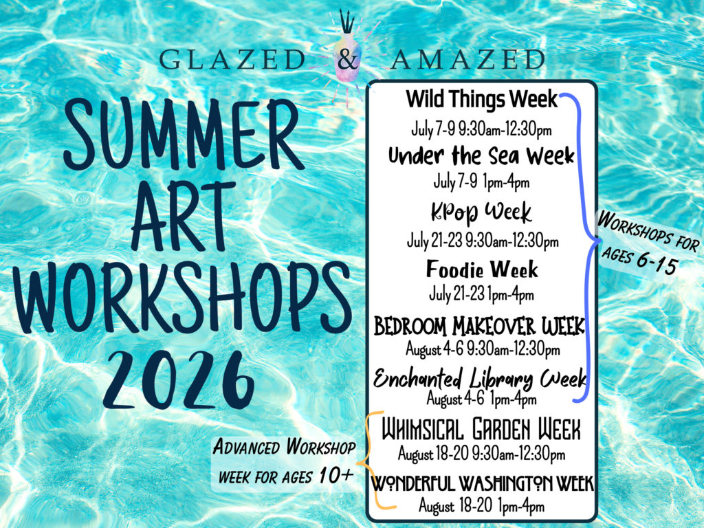 Glazed & Amazed Summer Art Workshop for 2026 is sure to be a big hit! During July and August of 2026 we will hold summer art workshops upstairs in our new event space. Weeks 1-3 will be open to all children ages 6 and up. Art Workshop week 4 is a special advanced art workshop for kids ages 10+! All three day art workshop include a canvas project, a glass project, a pottery project, a clay project and a snack. Our summer art workshops are led by a studio instructor who gives the children step by step guidance through every project. Some projects will be ready to take home that same week, and some projects may have to be left at the studio to fire and be ready to pick up in about 2 weeks.